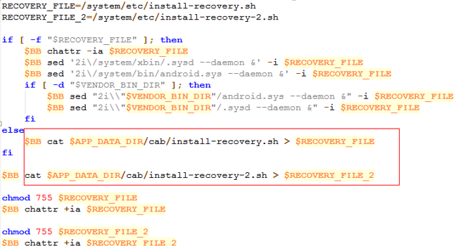 Fushicho病毒运行时会替换系统的启动脚本文件install-recovery.sh、install-recovery-2.sh,新的脚本文件将在手机启动后立即给Fushicho病毒赋予root权限。