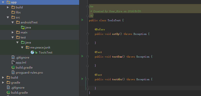 创建成功后会在app/src/test/java/me/peace/junit下生成测试类(me/peace/junit即Destionation package)
