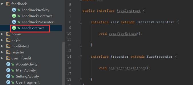 比如下面的代码,就是示例项目中意见反馈页面的Contact协议类,提供了View和Presenter的接口。