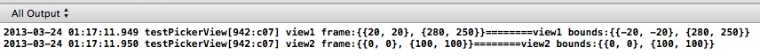 NSLog(@"view1 frame:%@========view1 bounds:%@",NSStringFromCGRect(view1.frame),NSStringFromCGRect(view1.bounds));