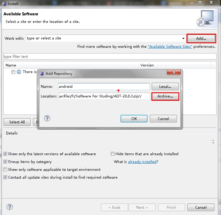 ③我推荐直接通过下载好的ADT插件压缩包进行安装(此种方式可以在离线环境下进行)。具体步骤是:在新打开的对话框中点击“Add”按钮->在打开的对话框中点击“Archive”按钮选择之前已经下载好保存在本地硬盘的ADT插件压缩包,至于上面的“Name”可以随便取,这只是一个代号而已,没什么实际作用。
