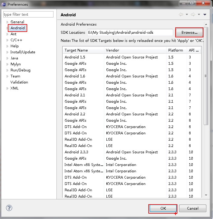 ⑤在弹出来的对话框中选中左边栏的“Android”->通过右侧的“Browse...”按钮选择SDK的安装路径根目录->点击最下方的“Ok”按钮,这样SDK就在Eclipse上加载成功了。