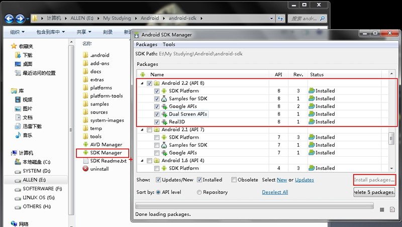 ③打开Android SDK的安装目录,双击 "SDK Manager"->在打开的窗口中先选择你需要安装的SDK版本,其中“Status”表示该SDK包是否安装,如我选的是“Android2.2(API 8)”(我的之前已经安装过了,所以“Status”为“Installed”)->再点击“Install packages...”按钮,在弹出来的窗口中最好选“Accept All”这样才能安装你刚才选的所有的包->最后点“Install”按钮就开始安装了,整个过程会很慢,这需要你的耐心。