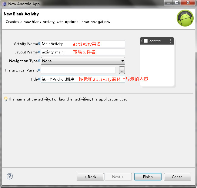 ②在新弹出的窗口中按下图提示填写相关信息,一路“Next”,直到点击“Finish”,这样第一个Android程序就创建好了,这是你会发现Eclipse左边多了一个你新创建的Android项目。