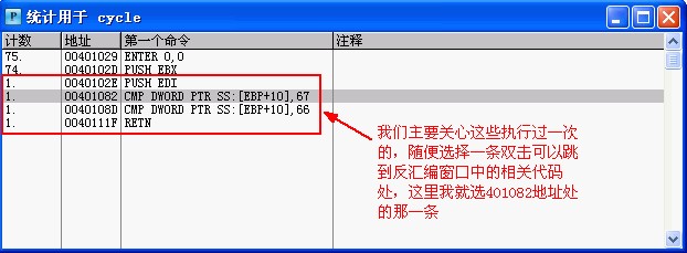RUN 跟踪会把地址、寄存器的内容、消息以及已知的操作数记录到 RUN 跟踪缓冲区中,你可以通过查看 RUN 跟踪的记录来了解程序执行了那些指令。在这还要注意一个缓冲区大小的问题,如果执行的指令太多,缓冲区满了的话,就会自动丢弃前面老的记录。我们可以在调试选项->跟踪中设置: 现在我们回到 OllyDBG 中,点击菜单调试->打开或清除 RUN 跟踪(第一次点这个菜单是打开 RUN 跟踪,在打开的情况下点击就是清除 RUN 跟踪的记录,对 RUN 跟踪熟悉时还可以设置条件),保证当前在我们调试的程序领空,在反汇编窗口中点击右键,在弹出菜单中选择 RUN 跟踪->添加所有函数过程的入口: 我们可以看到 OllyDBG 把识别出的函数过程都在前面加了灰色条: 现在我们回到那个 crackme 中按那个“Check”按钮,被 OllyDBG 断下了: 这时我们点击菜单查看->内存,或者点击工具栏上那个“M”按钮(也可以按组合键 ALT+M),来到内存映射窗口: 为什么在这里设访问断点,我也说一下。我们可以看一下常见的 PE 文件,没加过壳的用 PEiD 检测是这样: 点一下 EP 段后面那个“>”符号,我们可以看到以下内容: 看完上面的图我们应该了解为什么在 401000 处的代码段下访问断点了,我们这里的意思就是在消息断点断下后,只要按 F9 键运行时执行到程序代码段的指令我们就中断,这样就可以回到程序领空了(当然在 401000 处所在的段不是绝对的,我们主要是要看程序的代码段在什么位置,其实在上面图中 OllyDBG 内存窗口的“包含”栏中我们就可以看得很清楚了)。设好访问断点后我们按 F9 键,被 OllyDBG 断下: 现在我们先不管,按 F9 键(或者按 CTR+F12 组合键跟踪步过)让程序运行,再点击菜单查看->RUN 跟踪,或者点击工具栏上的那个“…”符号,打开 RUN 跟踪的记录窗口看看: 我们现在再来看看统计的情况: 在地址 401082 处的那条指令上双击一下,来到以下位置: 现在我们在地址 4010A6 处的那条指令上按 F2,删除所有其它的断点,点菜单调试->关闭 RUN 跟踪,现在我们就可以开始分析了: