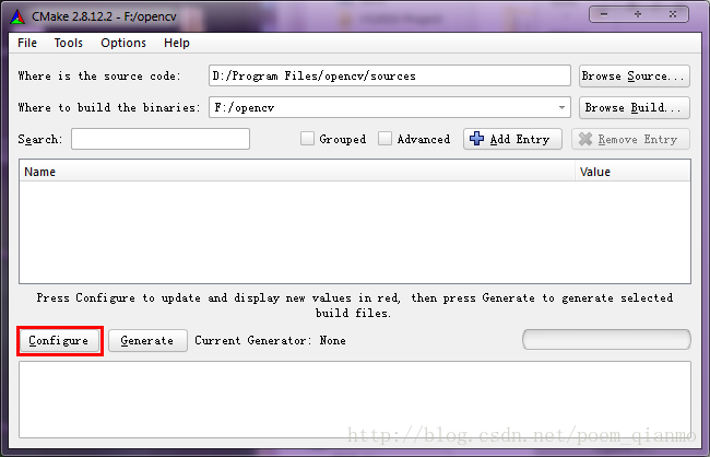 如下图,点击红色方框内的“Browse Build”按钮,在弹出的对话框中指定我们存放生成的opencv解决方案的路径。比如F:/opencv。