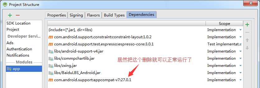 查了下也没发找到答案,什么删除.gradle重新clean没用,删除.idea和其它配置,重新导入工具再编译一样没用,最后看到一篇文章,说是.jar包重复,说是去掉就可以了。其实我工程里面是没有重复引用的jar库,但是居然真的是解决了。打开工程的依赖项,删除里面的项appcompat-v7包就行了