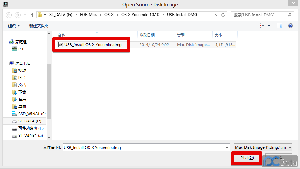 5、在弹出的对话框中,找到下载好的USB_Install OS X Yosemite.dmg镜像,点击打开:
