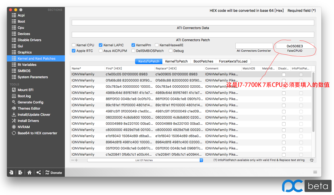 顾名思义kernelAndKextPatches表示内核及驱动的破解补丁。Clover支持两种自定义的驱动破解方式:一种是破解二进制文件;还有一种是修改驱动的info文件,就跟仿冒驱动一样。坛子里有相关教程我就不过多解释了。我主要阐述在本机的配置下如何使用kernelAndKextPatches补丁来驱动相应的硬件设备。因为我用到的是7代的CPU,所以我们要把CPUID仿冒成6代的,这样才能让macOS Sierra识别,否则无法引导安装!如下图: