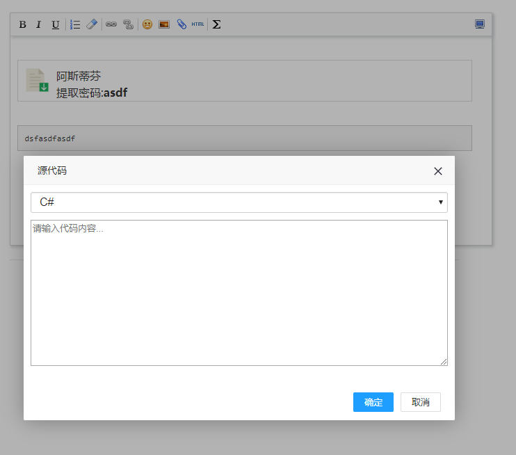 <!DOCTYPE html> <html> <head> <meta charset="utf-8" /> <title></title> <script src="/lib/jquery/jquery-3.2.0.min.js"></script> <link href="/style/css/zui.min.css" rel="stylesheet" /> </head> <body> <div class="container-fluid"> <form class="form-horizontal form-condensed" method="post"> <div class="form-group"> <div class="col-md-4" style="width:620px;margin-top:10px;"> <select class="form-control" onchange="MonitorTypeChanage()" style="height:30px;font-size:16px;" id="CodeType"> <option value="csharp">C#</option> <option value="javascript">JavaScript</option> <option value="html">HTML</option> <option value="css">CSS</option> <option value="SQL">SQL</option> </select> </div> </div> <div class="form-group"> <div class="col-md-12"> <textarea style="height:210px;width:600px;" oninput="MonitorContentsInput()" id="CodeContents" name="CodeContents" placeholder="请输入代码内容..."></textarea> </div> </div> </form> </div> <script type="text/javascript" src="code.js"></script> </body> </html>