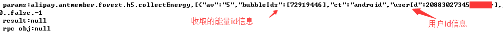 入口参数中的确包含了当前收取的能量id和当前用户信息,而这两个参数我们现在已经都能获取到了,看看收取之后的返回信息: