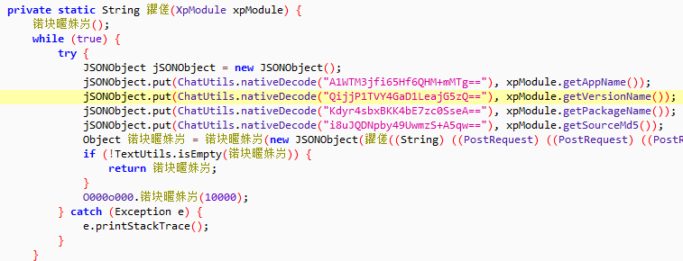 最近有位同学发了一个样本给我,主要是有一个解密方法,把字符串加密了,加解密方法都放在so中,所以之前也没怎么去给大家介绍arm指令和解密算法等知识,正好借助这个样本给大家介绍一些so加密方法的破解,首先我们直接在Java层看到加密信息,这个是这位同学直接告诉我这个类,我没怎么去搜了: