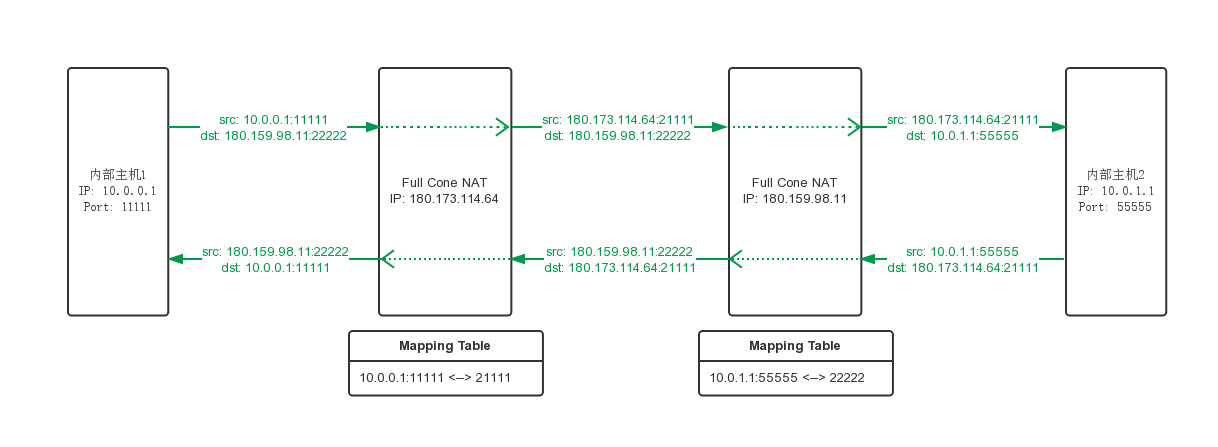 2. Full Cone NAT 与 Restricted Cone NAT或Port Restricted Cone NAT在互相告知IP和Port后,如果由Full Cone NAT端先发送数据包,会失败,必须由Restricted Cone NAT或Port Restricted Cone NAT端先发送数据包给Full Cone NAT,之后双方即可互相通讯。