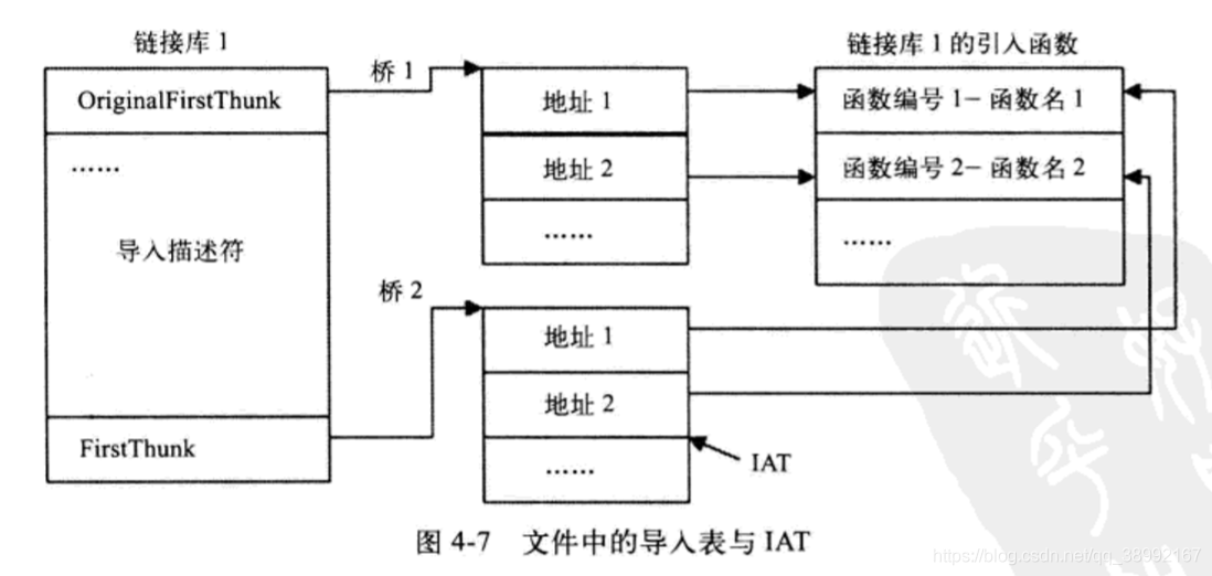导出表中有两个成员,OriginalFirstThunk和FirstThunk。他们一开始指向的是不同的IMAGE_THUNK_DATA结构体数组。但是这两个数组指向的内容却是相同的。