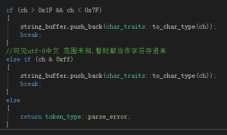 json j = json::parse("{\"name\":\"中文\"}");错误 return token_type::parse_error;