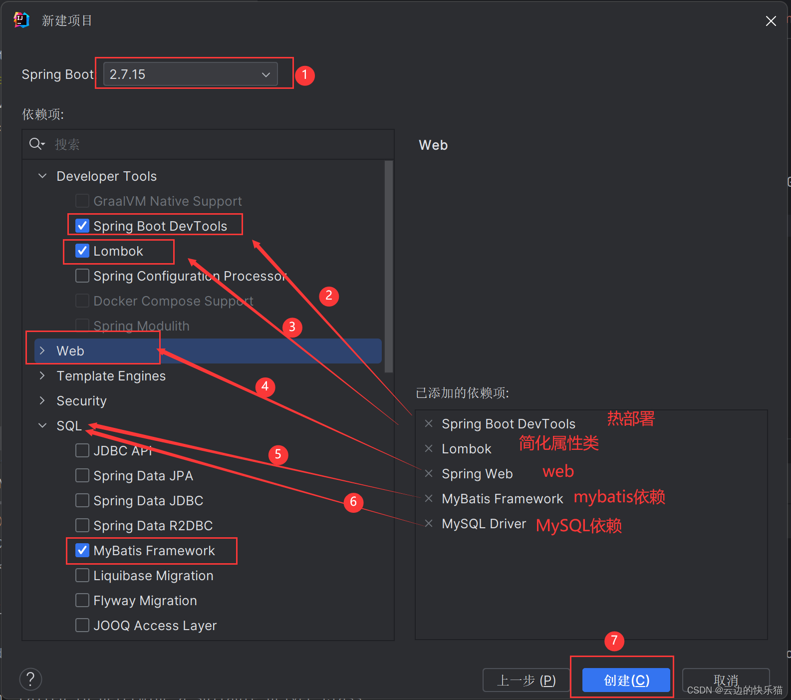 这种方式创建的时候自动帮我们加载MySQL的依赖和mybatis的依赖,就不用在pom.xml文件里面再去导入了,版本都是跟着springboot父版本来,也一定程度上避免了版本冲突。但是必须在配置文件里面配置数据库的信息,要不然启动报错。