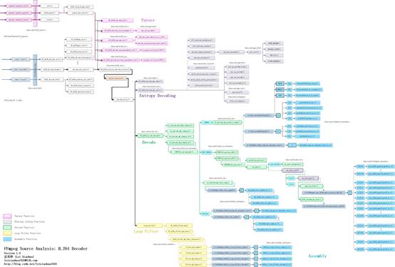 函数在图中以方框的形式表现出来。不同的背景色标志了该函数不同的作用:白色背景的函数:普通内部函数。 粉红色背景函数:解析函数(Parser)。这些函数用于解析SPS、PPS等信息。 紫色背景的函数:熵解码函数(Entropy Decoding)。这些函数读取码流数据并且进行CABAC或者CAVLC熵解码。 绿色背景的函数:解码函数(Decode)。这些函数通过帧内预测、帧间预测、DCT反变换等方法解码压缩数据。 黄色背景的函数:环路滤波函数(Loop Filter)。这些函数对解码后的数据进行滤波,去除方块效应。 蓝色背景函数:汇编函数(Assembly)。这些函数是做过汇编优化的函数。图中主要画出了这些函数的C语言版本,此外这些函数还包含MMX版本、SSE版本、NEON版本等。