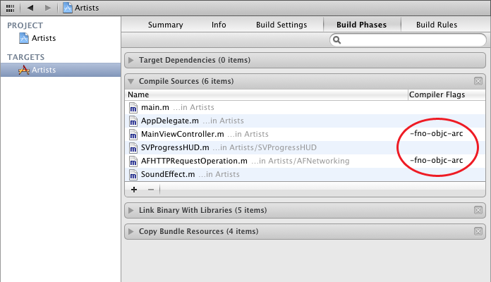 然后再编译,没有任何错误和警告了,好棒~等等…我们刚才没有对MainViewController和AFHTTPRequestOperation进行处理吧,那么这两个文件里应该还存在release之类的东西吧..?看一看这两个文件,果然有各种release,但是为什么能编译通过呢?!明明刚才在自动转换前他们还有N多错的嘛…答案很简单,在自动转换的时候因为我们没有勾选这两个文件,因此编译器在自动转换过后为这两个文件标记了”不使用ARC编译”。可以看到在target的Building Phases下,MainViewController.m和AFHTTPRequestOperation.m两个文件后面被加上了-fno-objc-arc的编译标记,被加上该标记的文件将不使用ARC规则进行编译。