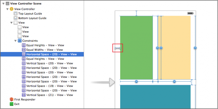 如果你在Document Outline中点击一个约束,Interface Builder将会在视图中高亮出它: