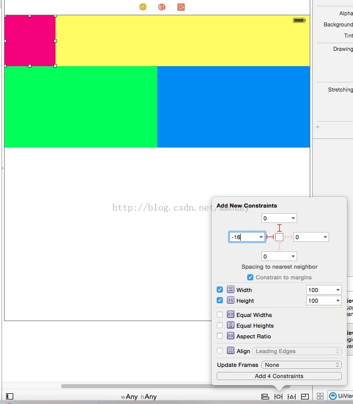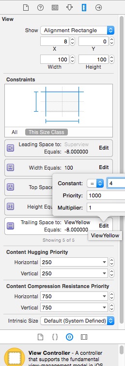 然后继续为各个View添加约束,首先是红色和黄色方块的间距,如下图: