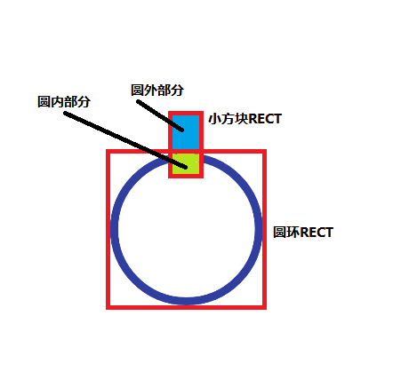 接下来要处理一个更加复杂的问题,就是进入圆环中的方块部分,要变粗。 为了解决这个问题,我们就需要分辨方块哪部分在圆内,哪部分在圆外,这个判断起来本身就很麻烦,况且,圆环还会被压缩!也就是园内圆外,没有一个固定的分界点!怎么区分圆内圆外呢?我决定自己判断太麻烦了,后来想到一个办法,判断交集! 我们知道,Android提供了API,让我们可以判断两个Rect是否相交,也可以获得它们的相交部分(也就是重合部分),还可以获得非重合部分。 假设我把方块看成是一个矩形,圆环看成一个矩形,那么问题就简单了,我就可以调用API计算出进入圆内的部分,和在圆外的部分了。 如下图:
