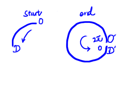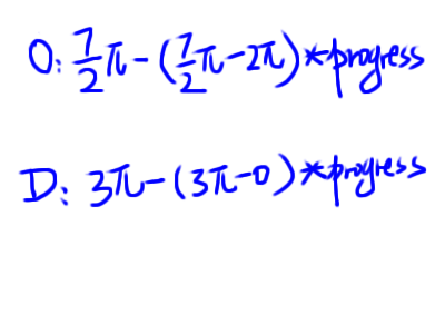 结束时O、D我们确定了,那么开始的时候呢,我们要看下动画中O、D的运行轨迹了。 观察动画,我们可以得出O、D的运行轨迹是这样的 可以看出,O点逆时针(逆时针可以认为角度在减小,可以再参考上文中UIBezierPath的官方文档中的那张图)绕了3/4圈到2π,D点逆时针绕了1.5圈到0; 因此我们可以得出O、D的角度变化,是这样的 即O点从7/2的π减小到2π,D点从3π减小到0。