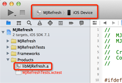 選擇真機設備,然後 Command+B 編譯, libMJRefresh.a 文件從紅色變爲黑色