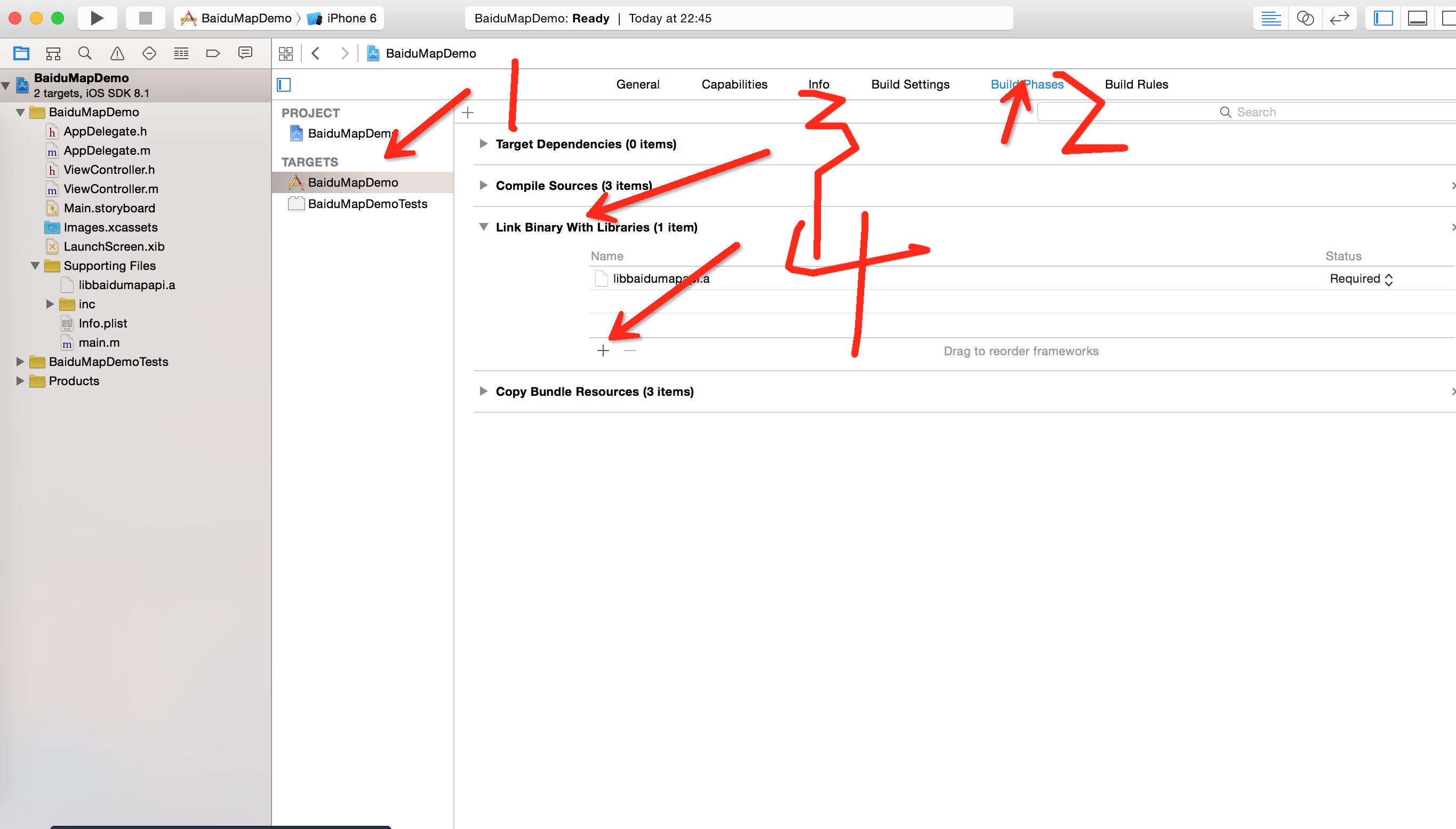 3.3.4 将生成的libbaidumapapi.a文件拷贝到工程根目录并导入即可